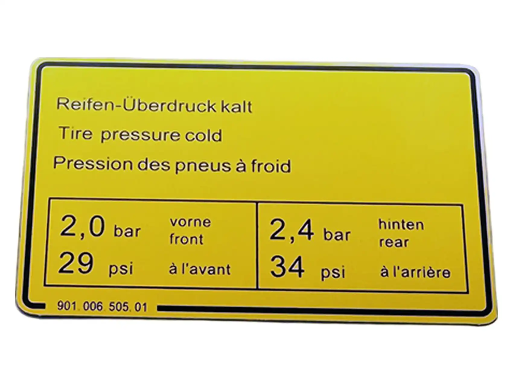 Dieser Reifendruck-Aufkleber ist ein Detail, das den Unterschied macht und die Werks-Authentizität Ihres Klassikers unterstreicht. Investieren Sie in die Details, die den Gesamtwert und die unvergleichliche Ausstrahlung Ihres Fahrzeugs steigern. Bestellen Sie jetzt und vervollständigen Sie die historische Korrektheit Ihres 911!