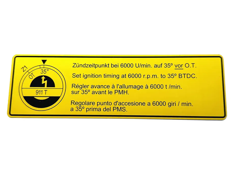Dieser Zündzeitpunkt-Aufkleber ist ein Detail, das den Unterschied macht und die Werks-Authentizität Ihres Klassikers unterstreicht. Investieren Sie in die Details, die den Gesamtwert und die unvergleichliche Ausstrahlung Ihres Fahrzeugs steigern. Bestellen Sie jetzt und vervollständigen Sie die historische Korrektheit Ihres 911 T!